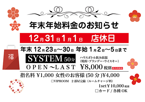 いつもご愛顧ありがとうございます。年末年始の営業と年末年始料金について以下にてお知らせいたします。